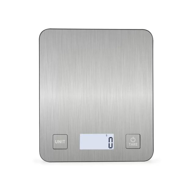 Sleek brushed stainless steel platform, modern look Clear blue LCD display for easy reading High precision measurement Tare function and multiple unit conversion Durable and easy to clean